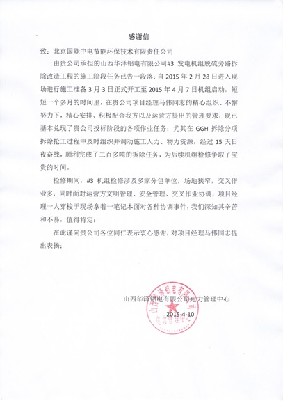 山西華澤鋁電旁路改造EPC項目受業主表揚